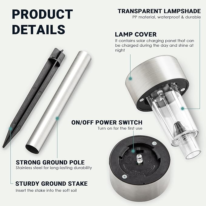 - Two Minutes Project: One minute to assemble the parts (turn the switch on before assembling) and another minute to insert it into ground, then it works in your garden, porch or yard