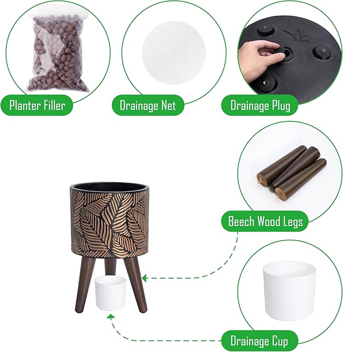 - What’s included: planter pot with drainage hole, drainage plug, set of stand – 3 solid wooden legs.