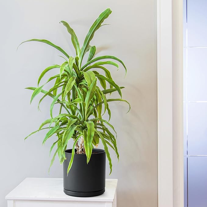 D'vine Dev 8 Inch Ceramic Planter Pot with Drainage Hole and Saucer, Indoor Cylinder Round Planter Pot, Black, 94-O-D-2
