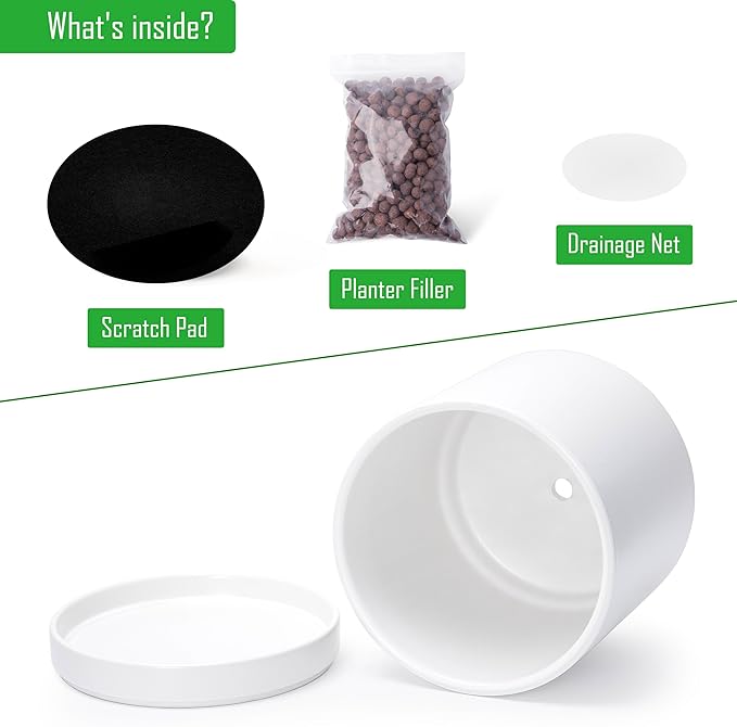 - Planter pot with drainage hole, mesh drainage net and protective scratch pad included.