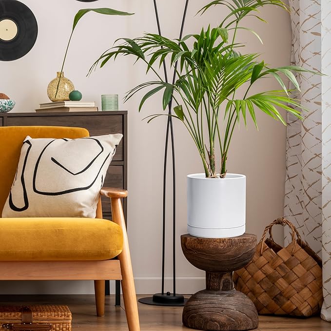 D'vine Dev 8 Inch Ceramic Planter Pot with Drainage Hole and Saucer, Indoor Cylinder Round Planter Pot, White, 94-O-D-1