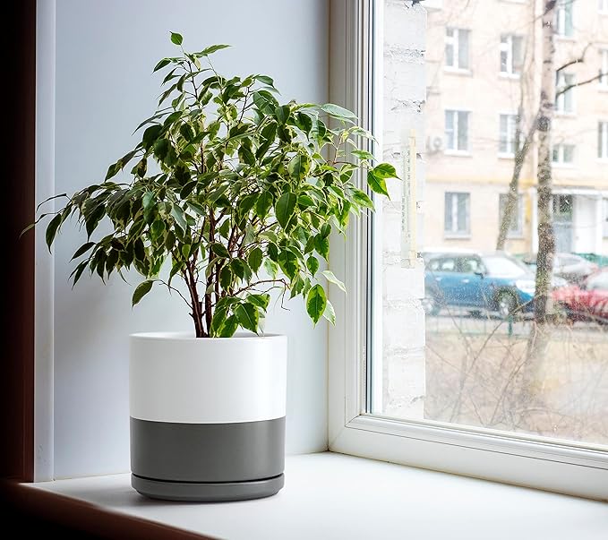- Simple, elegant, and modern cylindrical straight round planter pot with saucer and drainage hole.