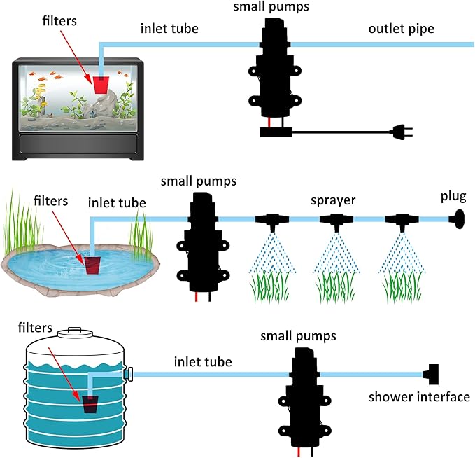 - Application: Before formal use, please connect the water inlet to the pressurized water supply pipe, and after a few minutes of power on trial operation, move it to the working environment. Please use DC12V 5A-8A power supply. IEIK fresh water pressure diaphragm pump can be used for automatic pump, ocean, ship, camper, RV, agricultural spray (weak acid and weak alkali) and truck.