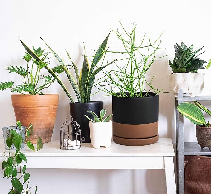 D'vine Dev 6 Inch Ceramic Planter Pot with Drainage Hole and Saucer, Indoor Cylinder Round Planter Pot, Black/Speckled Tan, 94-O-C-7