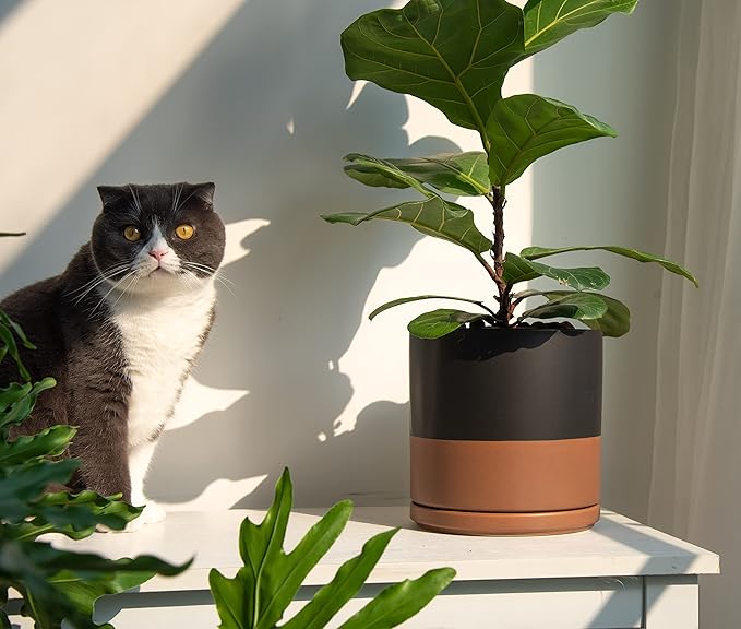 D'vine Dev 8 Inch Ceramic Planter Pot with Drainage Hole and Saucer, Indoor Cylinder Round Planter Pot, Black/Speckled Tan, 94-O-D-7