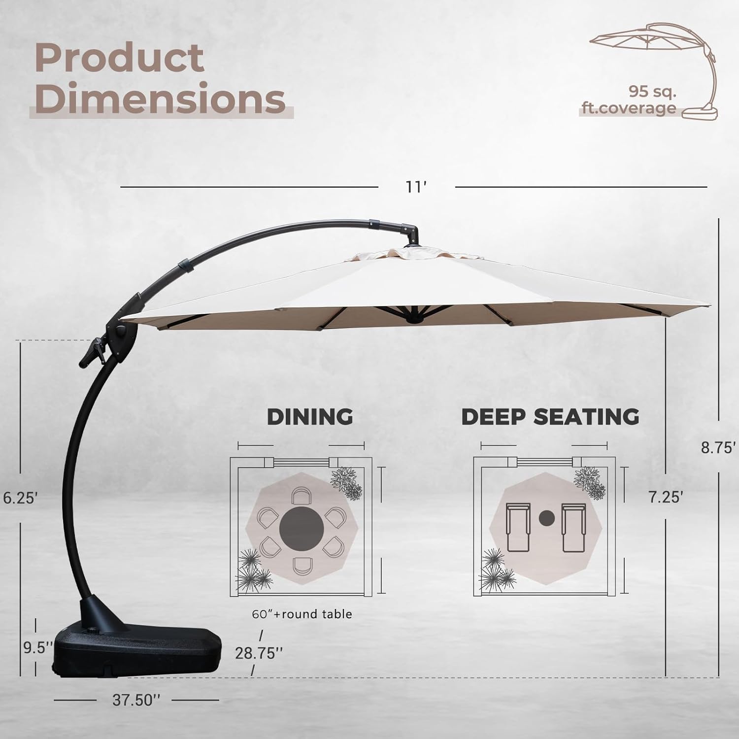 - COVER A LARGE AREA: This cantilever umbrella provides 95 square feet of relaxing cooling shade. Stay in the shade with our clever auto-lock system that allows you to reposition the tilt of the umbrella where needed as the sun moves throughout the day