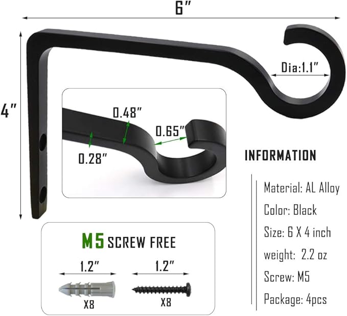 - 【EASY TO INSTALL】This package includes 2 plant hooks, 4 screws and 4 wall anchors, and maximum load up to 22 lb. Each screw is a standard M5 screw, 1.2 inches long. All you have to do is screw the screws into the wooden fence posts, deck posts and even the interior walls. It looks great in a variety of different environments.