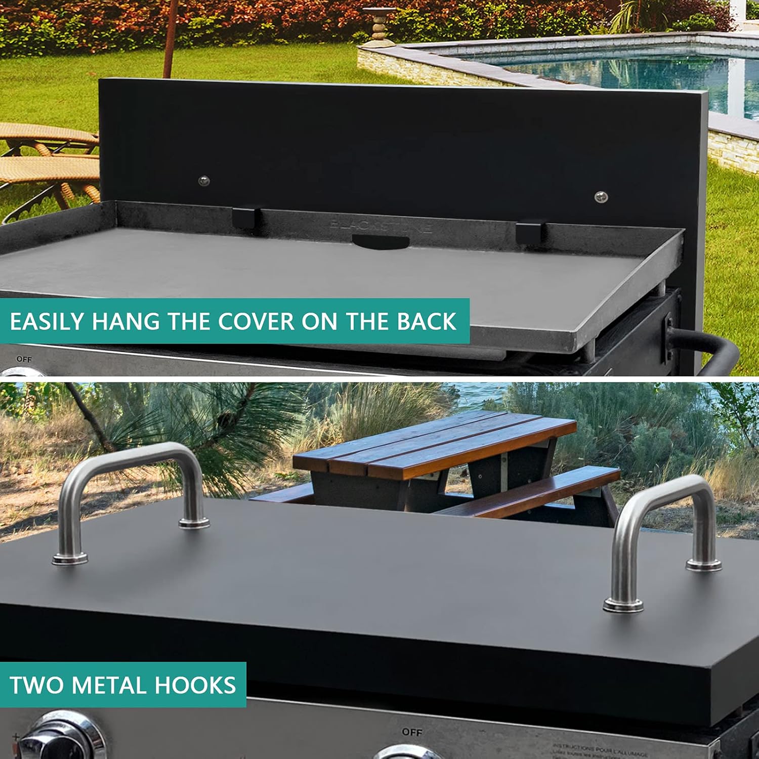 - The hard cover includes two brackets to hang the cover off the back of your griddle when not in use. The height of the two handles can support the grill cover, and the top of your grill cover will not collect water.