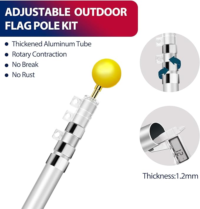- WAVIN THE USA FLAG - 16FT telescoping flag pole kit, 1.2mm Heavy thickness aluminum-16 gauge aluminum pole with cordless 360 degree rotation steel ring clips, totally tangle free and no furling, making the flag smooth and flexible waving in the air.We use a Embroidered American flag, so that the flag can withstand stronger wind without being torn.