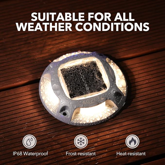 - 【IP68 WATERPROOF & SUPER STURDY】With an IP68 waterproof design and a tightly sealed battery compartment, these solar lights can resist any terrible weather, like a rainstorm, or daily heat. High-quality aluminum alloy shell effectively keeps these outdoor solar LED deck Lights from rusting and can withstand up to 3 tons of weight, no need to worry about automobile and kids stepping on.