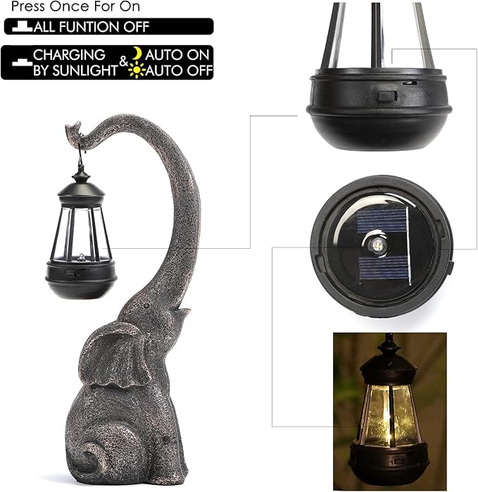• The solar elephant light decor comes with a solar powered light for outdoor lighting. The automatic solar powered light has a solar panel that absorbs sun light during the day to convert sunlight into electricity to recharge the AA Ni-MH battery (included). Solar power lights automatically turn on at night and turn off at dawn.