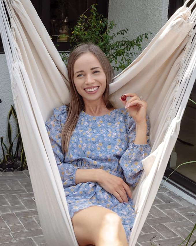 - Quality Material: This swinging hammock chair is made of high-density polyester and cotton. Soft and comfy. Please note: This fabric is not water-repellent