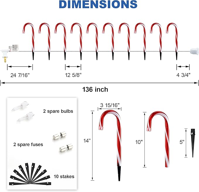 - 【Specification】The candy cane light is 10 inches tall; The stake is 5 inches; Total length is 11.3ft; Distance between each cane is 12.6 in. Built-in 5 bulbs in each candy cane. Total 10 candy cane lights.