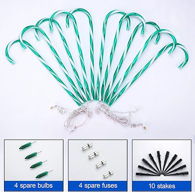 - 【What You Get】You will get a package of 10 pack 26'' candy cane lights, 10 stakes , 4 spare bulbs and 4 fuses. An detailed installation instruction ,finish the DIY installation only takes you a few minutes.