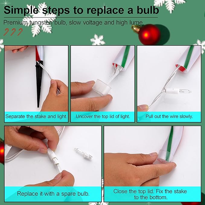 - 🎄【Safe & Durable】Passed UL certification test. IP 44 waterproof feature ensures the Christmas pathway lights can illuminate under a rainy, snowy day. Provide 4 spare fuses and bulbs for replacement in case.