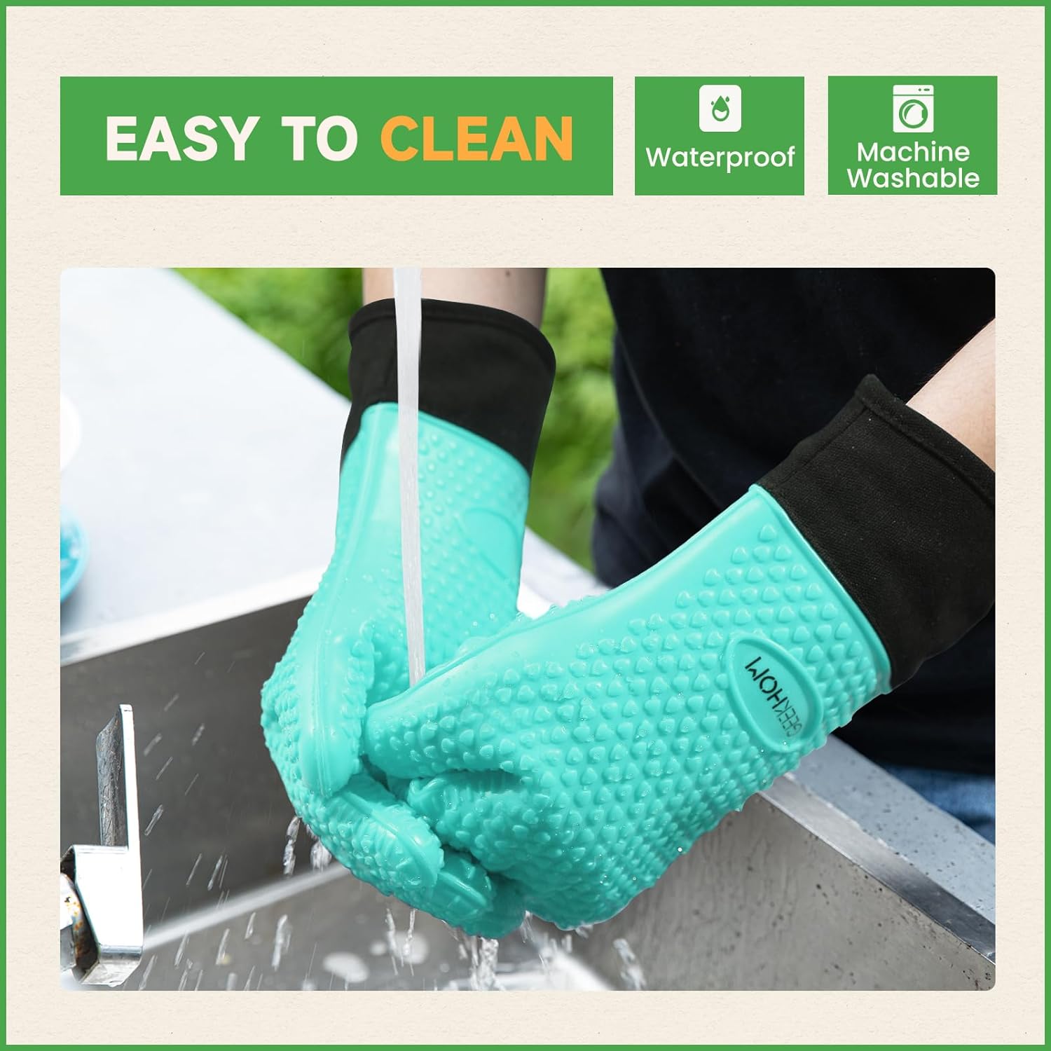 - Effortless Cleanup, Smarter Kitchen Flow: Waterproof silicone repels hot grease and marinade spills, while dishwasher-safe design erases stains in minutes; Hang the oven gloves compactly with the built-in loop—ideal for small kitchen spaces or tossing into camping gear without bulk