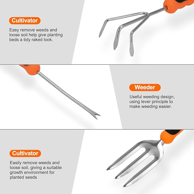 • 【Sturdy and Stainless Steel Garden Set】: Each tool has an ergonomically made soft handle, fashioned from high-quality TRP, that fits comfortably in small and large hands, on top of that, they’re intuitively designed to provide plenty of leverage and save you effort and strain when planting, weeding, and digging. Precisely scaled stainless steel blades that remain sharp for cutting. Sawtooth shovel for easy digging, 2.0 mm thickness, ensuring perfect insertion into the soil.