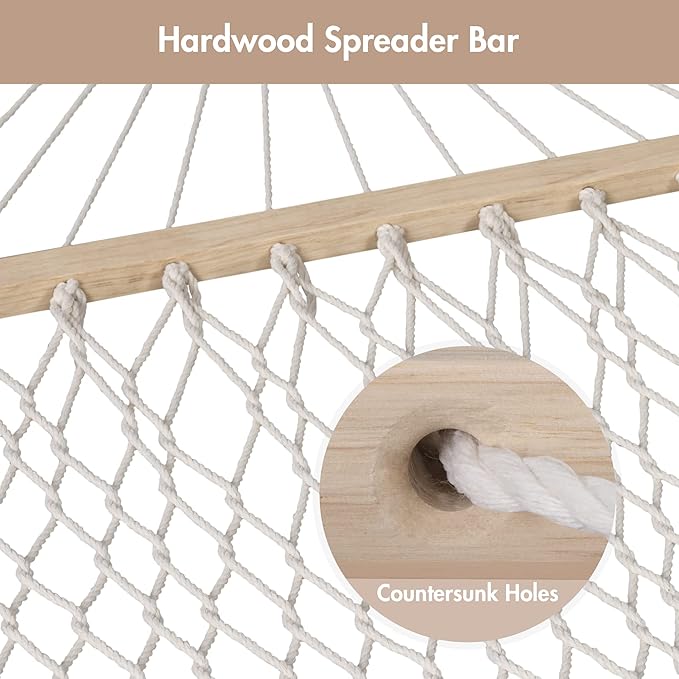 - SPREADER BAR HAMMOCK: 52 inches hardwood spreader bar has countersunk holes, hence reducing the friction between the rope and wood, offering maximum durability and stability. Our hammock significantly outperforms others’ non-countersunk varieties