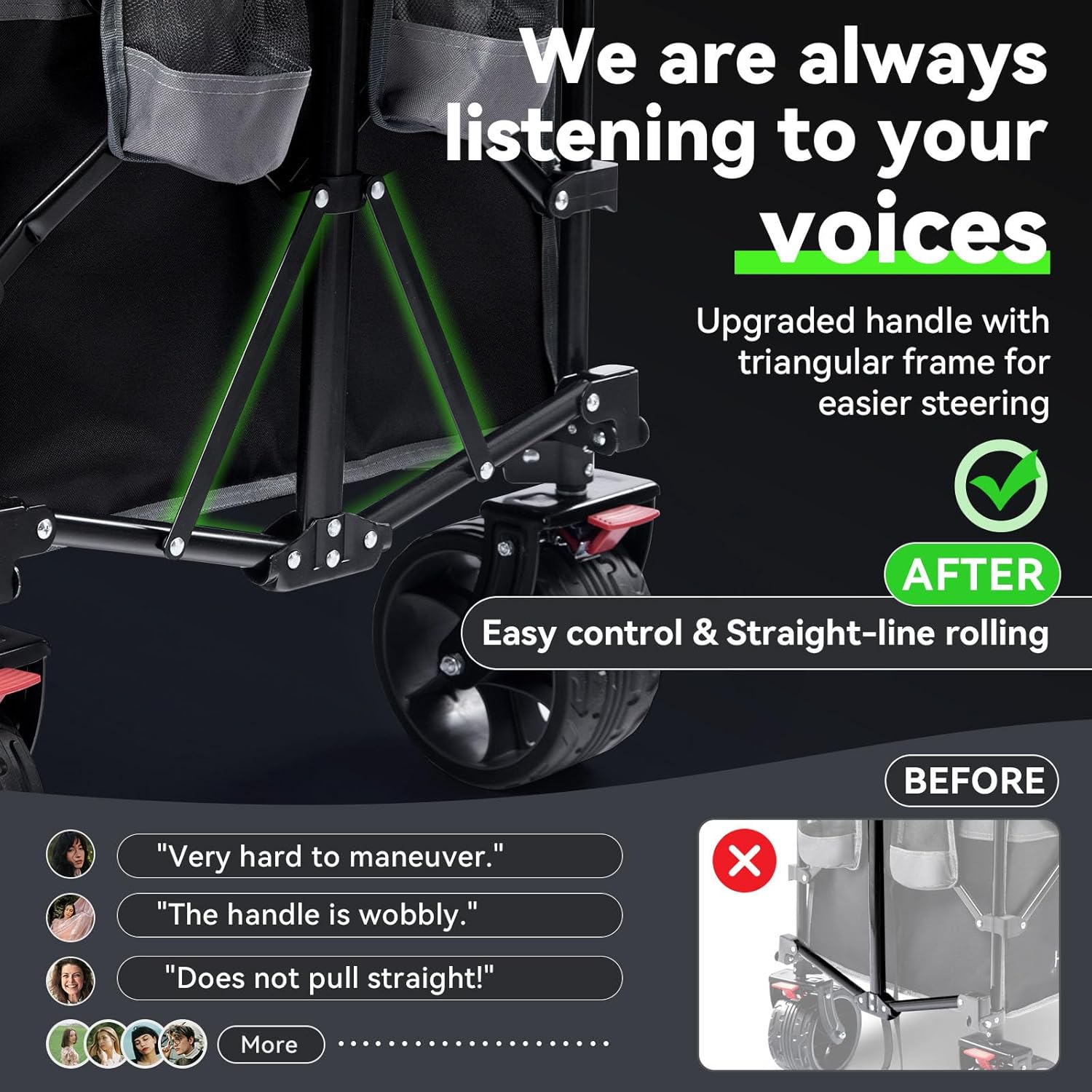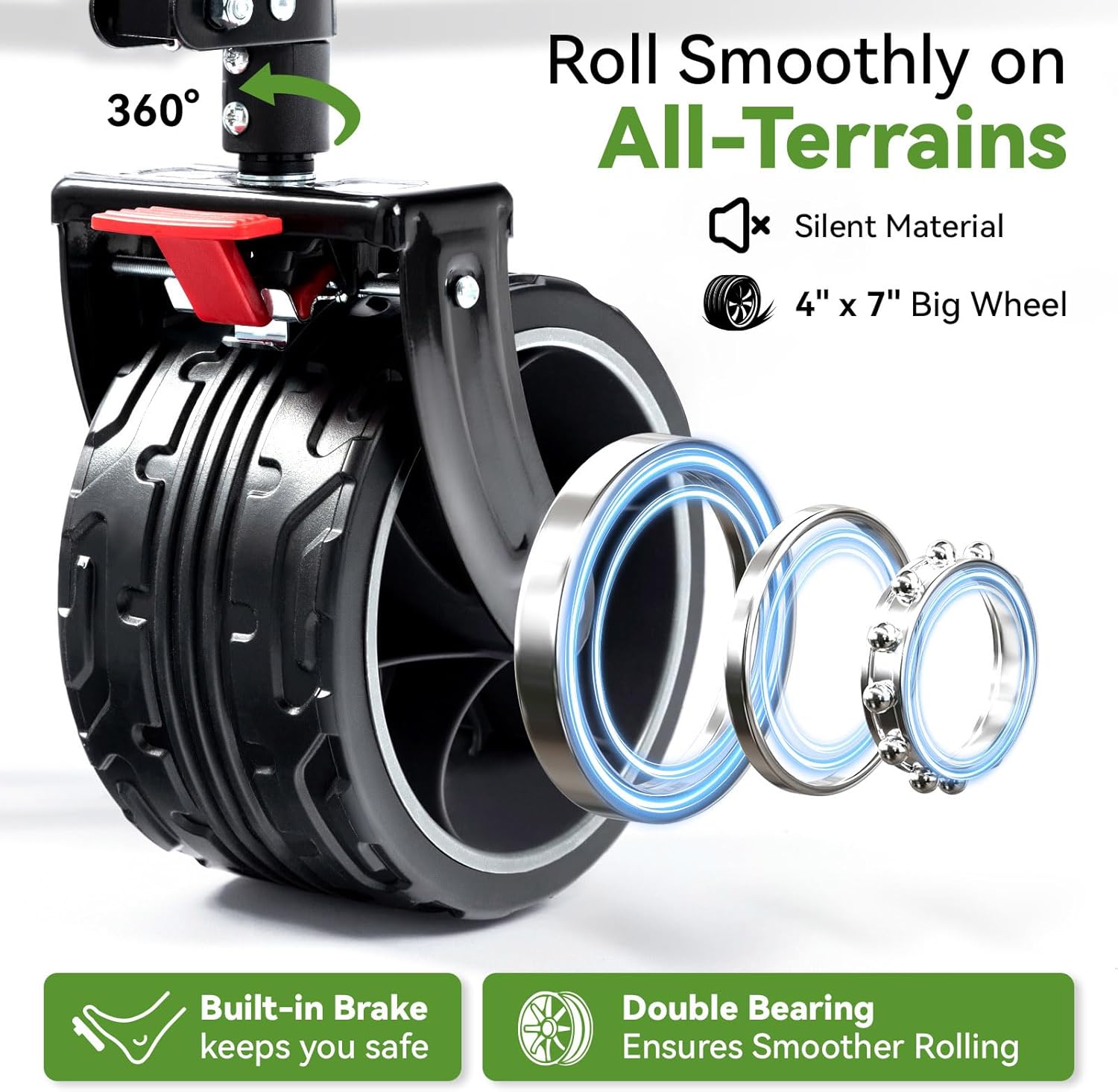 - 𝟐-𝐖𝐈𝐃𝐄𝐑 ◎ 𝐔𝐏𝐆𝐑𝐀𝐃𝐄𝐃 𝐖𝐇𝐄𝐄𝐋𝐒 𝐂𝐎𝐍𝐐𝐔𝐄𝐑 𝐀𝐋𝐋 𝐓𝐄𝐑𝐑𝐀𝐈𝐍𝐒 - Super large 4" wheels with unique anti-slip pattern make our collapsible wagon extremely capable of transporting load on multiple terrains, including sandy beach, grass and even rough terrains. The wheels of our beach cart are significantly wider than similar folding carts, resulting in dramatically better steering. The dual front wheels are 360-degree rotatable for easy maneuvering.