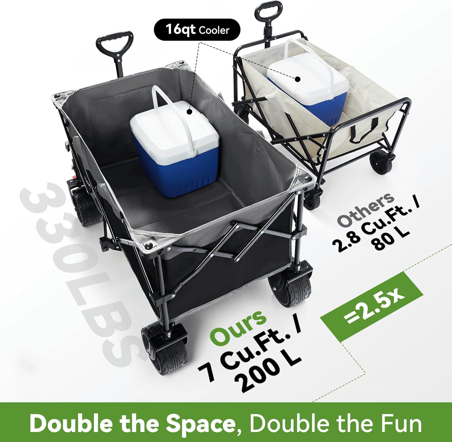 - 𝟏-𝐋𝐀𝐑𝐆𝐄𝐑 ⇔ 𝐌𝐀𝐘𝐁𝐄 𝐋𝐀𝐑𝐆𝐄𝐒𝐓 – You could hardly find a larger one. Our beach wagon is designed to be a real carryall. With a deeper and larger storage space, our wagon cart stands out from others thanks to its surprisingly enlarged capacity of 200L / 7 cubic feet, which means 3-4 times the capacity of a 24-inch suitcase or 5-7 times of a 20-inch suitcase. Just load it with everything you need and enjoy a nice adventure in the sun!