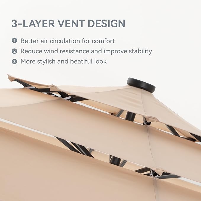 - 【Unique Vented Top Design Patio Umbrella】Practical design with 3 tier vented top which is conducive to air circulation and reducing sultry. Hot air or wind will flow through the multiple vents quickly which can make your umbrella more stable against windy conditions and cooler underneath