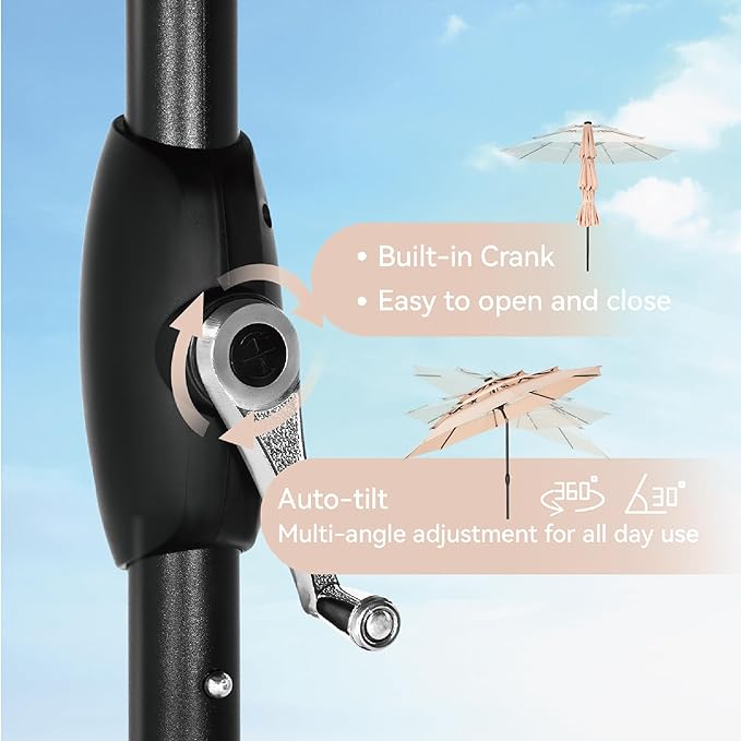 - 【Convenient Crank & Tilt System Table Umbrella】This outdoor umbrella is designed with crank open system for easy and quick use,The Auto tilt for all day use,for more angles of shading, keeping away from the hot sunlight. Ideal for both residential and commercial locations