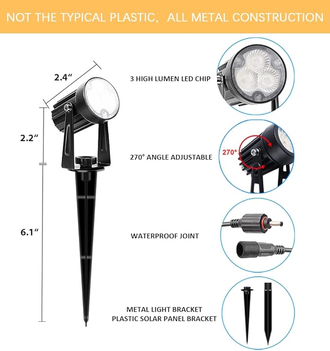 - 【Solar Powered】The landscape spotlights turn on automatically in the evening and power off at sunrise, which removes some irritating manual work.Great for adding accents to gardens or illuminate sculptures, fountains, or trees at night