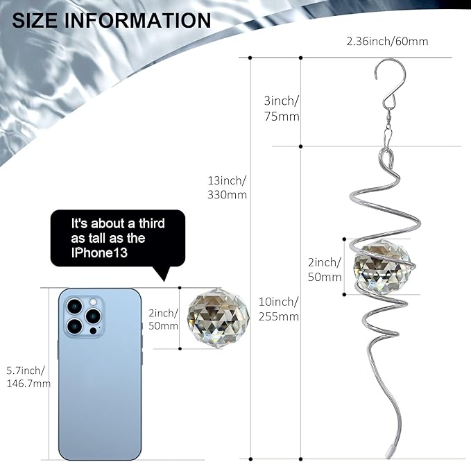 - 【 Cleverly Designed Spiral Tail 】When the Gazing Ball Spiral Tail spins, it has a magical hypnotic kind of effect. This crystal ball gives the illusion of moving up or down on a spiral tail. Gazing Ball Spiral is also a special crystal sun catcher rainbow maker. This spiral tail suncatcher captures rays of light, creating a cheerful light-scattering effect. Perfect for creating a relaxing atmosphere in your home, garden, patio or yard.