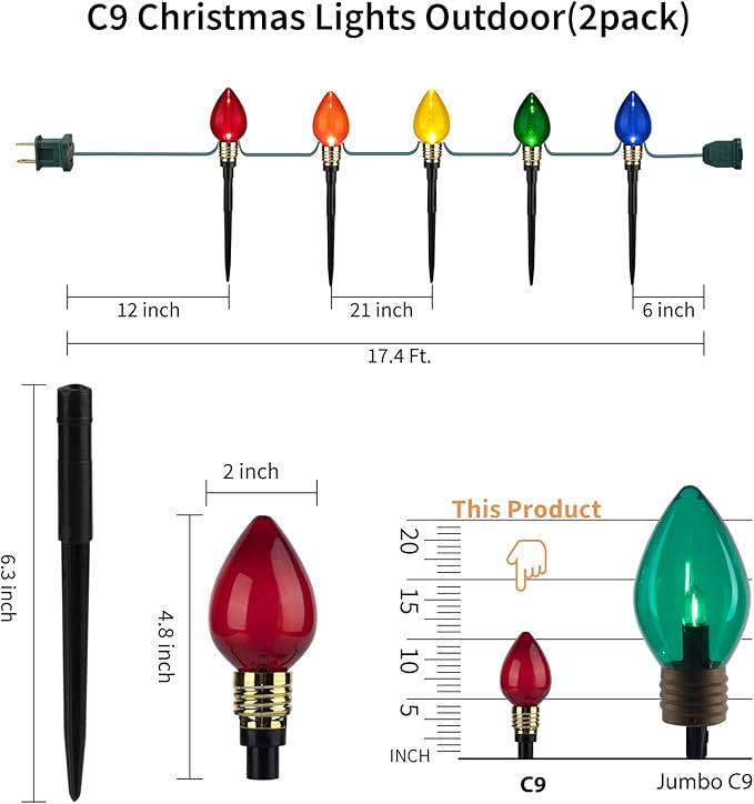 - Specifications of Christmas Path Lights Outdoor: 2 pack 17.4 feet C9 Christmas stake lights with 10 multicolored C9 bulbs. 21 inches light spacing, 6.7 inches pathway markers, plug in and enjoy it. This Christmas lights for the sidewalk will be great for your pathway, garden, courtyard, holiday decor