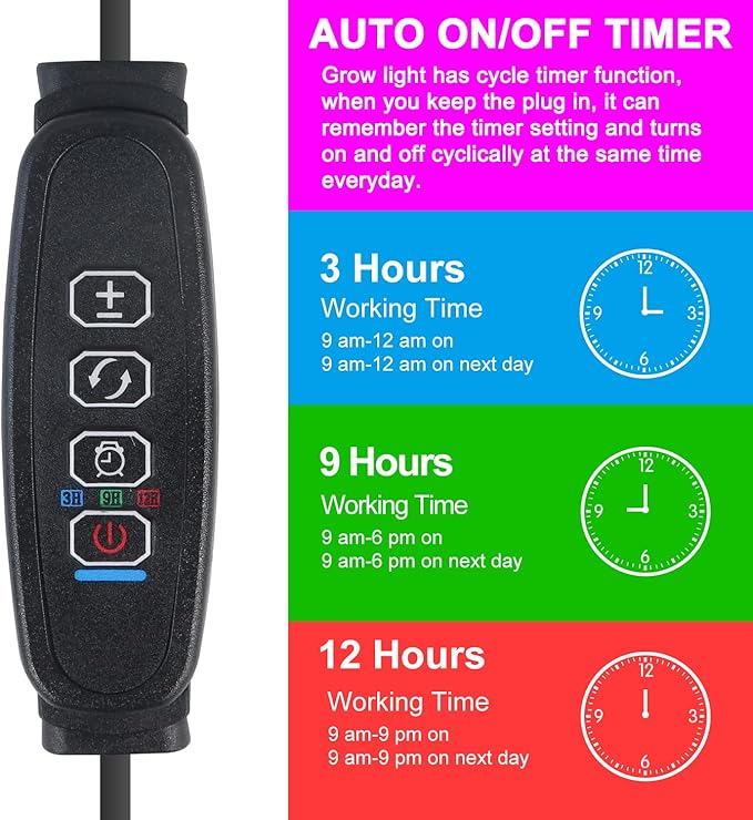 - 🌱【Timer Function & Multiple Settings】The indoor seedling light offer the circular memory timer function with 3 options-3h/9h/12h. When keeping power, it can automatically turn on and off every day according to your settings.