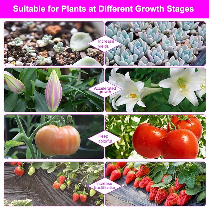 - 🌱【3 Color Settings & 10 Levels Dimmable】There are 3 color modes - Purple Light, Red Color, and Blue Color. Red light promotes photosynthesis, germination, blooming, and fruiting. Blue light ensures the plants take in more energy through chlorophyll synthesis to help germination and vegetable. The plant lights support you in adjusting the brightness to 0%-100% by operating the controller.
