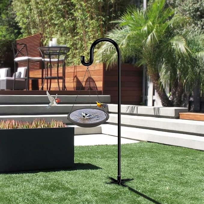 - INSTALLATION GUIDE: All heavy duty wrought iron plant pole hooks are equipped with installation instructions. Just make sure that every part is 100% tightened and they are ready to use, no extra tools or accessories needed. Warm tips: Do not directly hit the 5-prong base with hard objects, like hammer and we don’t recommend putting these hanging bird house stake into soft moist soil, which may cause the pole to tip over or bend down.