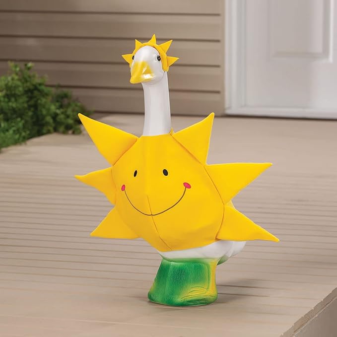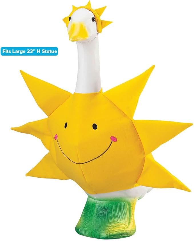 - Exclusive Eye-Catching Design: By GagglevilleTM, this outfit is specially designed to fit the large 23” goose statue. Sun goose outfit features bold, brilliant yellow fabric with a big, grinning face. Perfect for celebrating the summer solstice, brightening up your garden, or adding a touch of whimsy to your home décor.