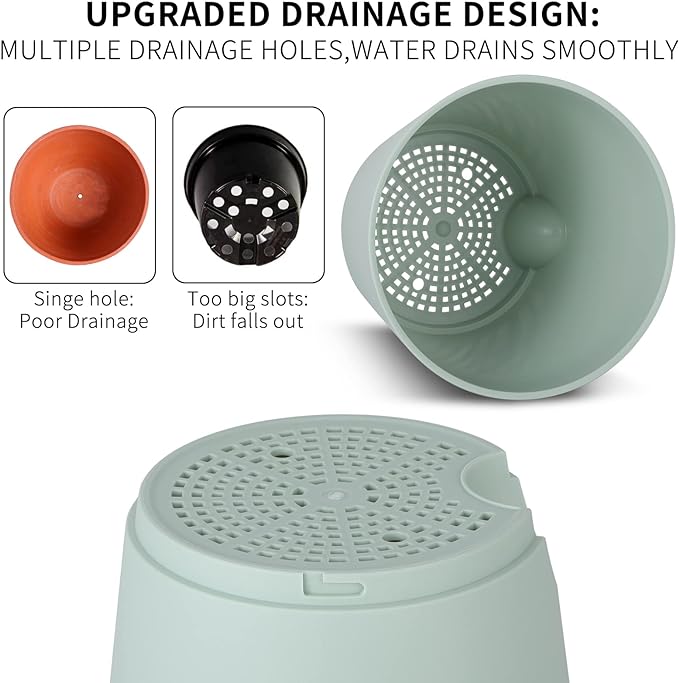 - 【Excellent Drainage Holes and Watering Lip】These flower pots for plants come with multiple drainage holes in the bottom. The holes and watering lip provide an air circulation system for the plant roots, which greatly reduces the problem of root rot of plants in a closed environment. The independent watering lip replenishes water for plants, so that water does not have to pass through the plant itself, At the same time, it is convenient to observe the current water level.