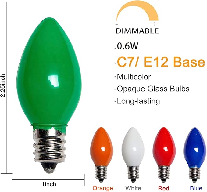 - Energy Saving LED Bulbs- C7 multicolor christmas led lights with E12/C7 candelabra socket base. Each bulbs 0.6 watt,120 Volt, 2700K warm white. Energy-saving c7 christmas lights replacement bulbs do not generate heat, and the temperature is lower than that of traditional incandescent bulb. low wattage will save more energy for you.