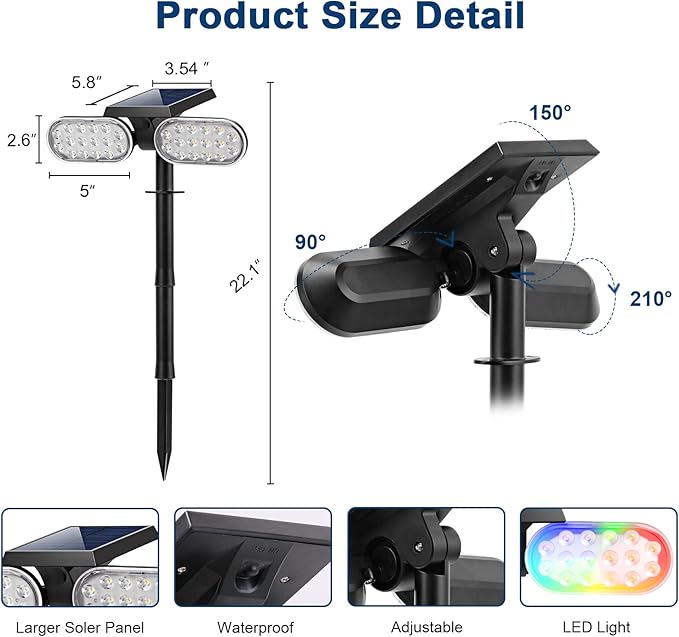 - << Double Heads 210° Adjustable >> Double heads design of our solar Spot Lights, the lighting area is larger, 210°adjustable no wires to run multicolored solar spotlight, Zero electricity bill.