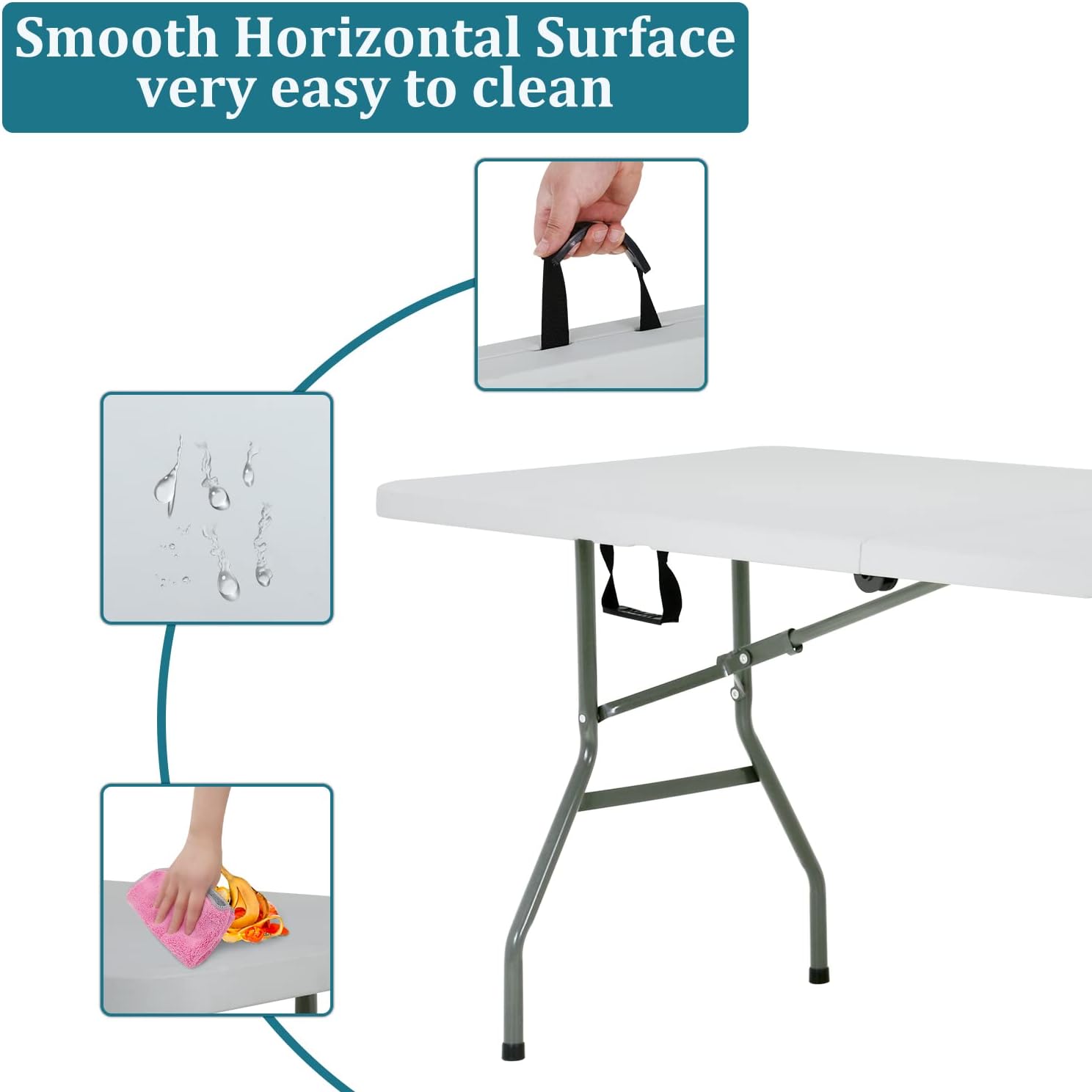 - 【Foldable】This 6ft picnic folding table can be folded in the middle and fastened with a safety catch for easy storage. You can put the folding table away in the trunk of your car, or in a small corner, and easily pick it up when you need it. camping tables that fold up lightweight.