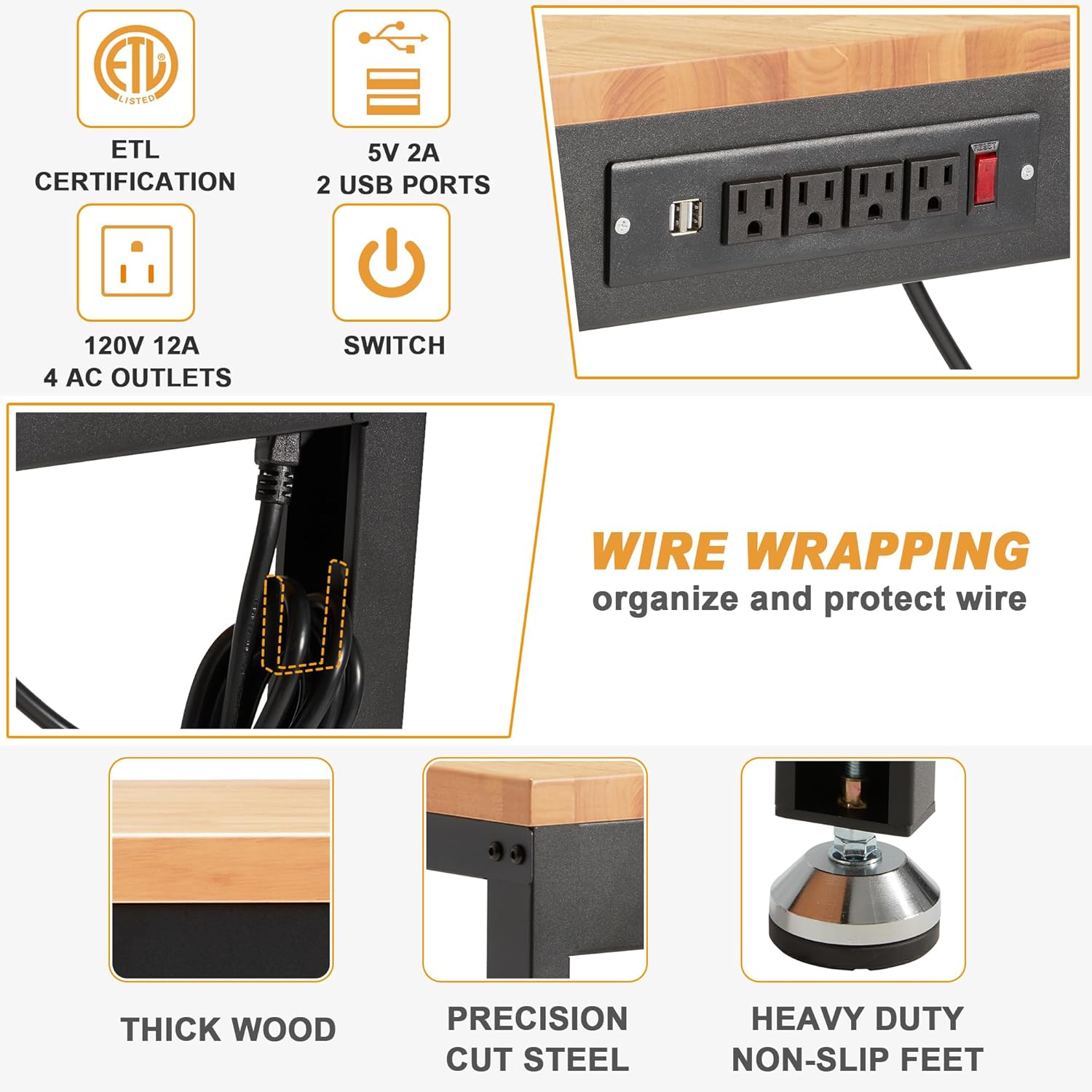- Etl Certification Power Outlets: Convenient to use various of electric tools and lamps; Totally 4 AC Outlets, 2 USB Ports and 1 Switch on the power strip which is ETL certified for safety and durability