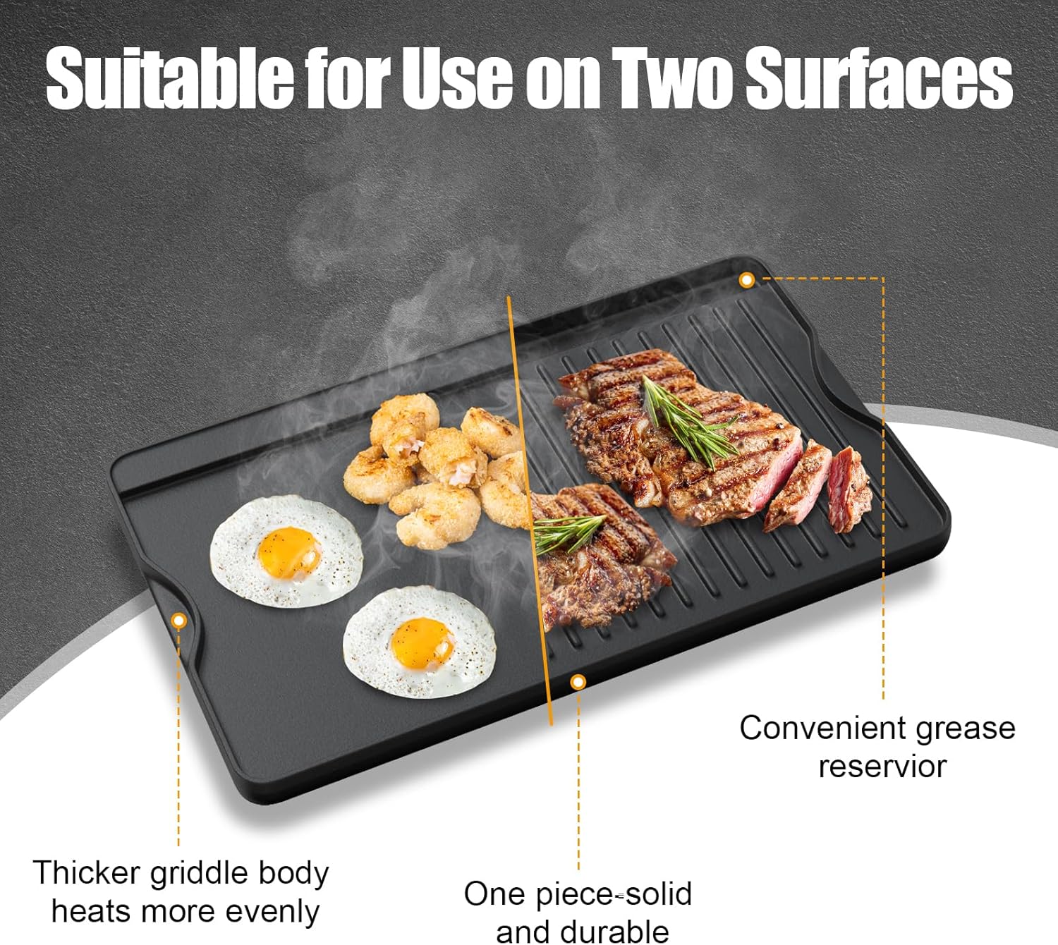- Fast Cook - The reversible grill griddle plate has even heat, cooking speed of food will much quicker than normal, heats up fast and evenly and distribution for delicious meal and perfect searing results. Recess design allows fat to drain downstream, providing a more delicious and healthy meal.