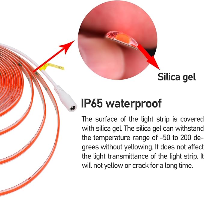 - 【COB LED STRIP】480LEDs/M, 2400LEDs/5M, COB light strips have more dense LED chips, Which make the emitting units nprecedentedly close to each other, and create super even lighting performance. At the same time, it brings higher luminous efficiency.