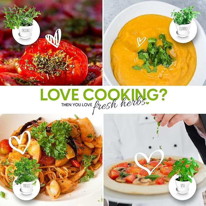 - Equipment & Accessories - This kit includes everything with nothing else to buy. You get 8 pots, 8 saucers to collect runoff, 8 expanding soil discs, and 1 kelp nutrition pack. We also include 8 transparent herb labels so you always know which pot holds which plant. Labels are printed in charming large Rae Dunn font to take the place of the usual stakes. These will look cute in your kitchen.