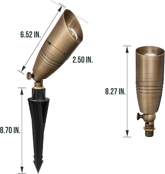 - Die-cast brass construction: This landscape spotlight is crafted from solid brass for durability and an elegant look. As it ages, a natural patina will develop, seamlessly integrating the lights into your landscape design.