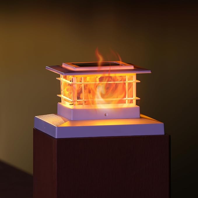 - WHITE PLASTIC SHELL DANCING FLAME SOLAR POST LIGHTS: 8 pack modern post cap lights powered by solar, each with 72 pcs yellow SMD LED, they are the perfect decorative outdoor lighting and no electricity required. Solar LED flickering flameless candles lights, add a 360 degree viewing angle illuminate charming to your garden, decorate your fence, deck, porch or yard. Measurement: 5.8 x 5.8 x 3.54 inches