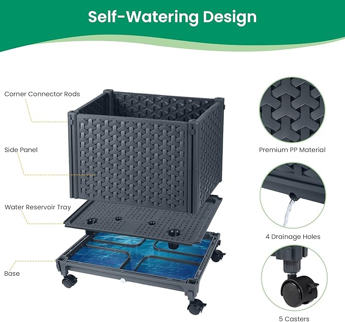 - 5 Optional Wheels: Come with 4 lockable swivel casters and 1 Non-swivel /Non-Locking caster. With wheels, you can effortlessly move your raised garden bed around for watering or trimming or roll it out to the garden/yard for better photosynthesis or shading. To keep it still, just use locking pins