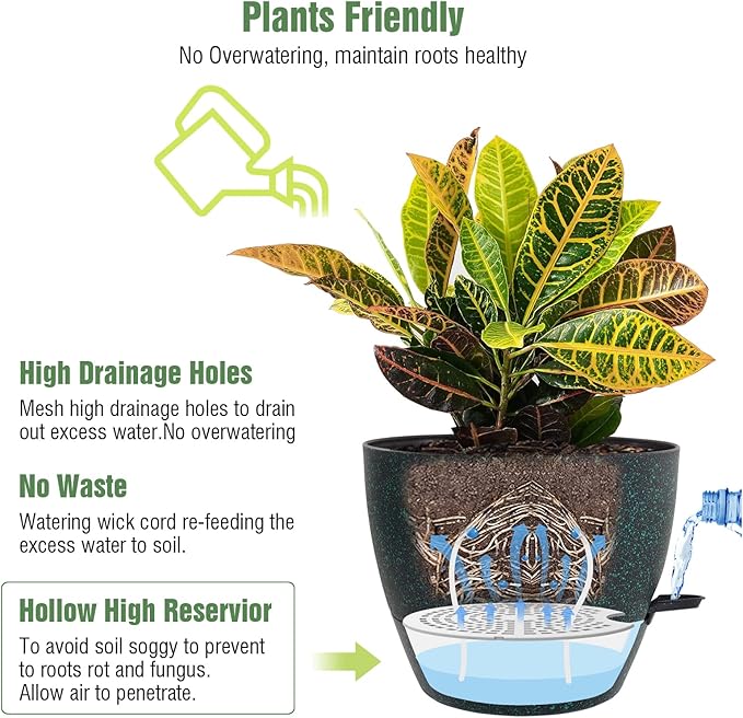 - Self-Watering Pots: Set of 3 plastic planters with mesh drainage holes and deep reservoir for indoor outdoor garden plants and flowers