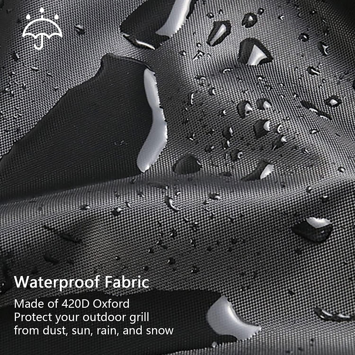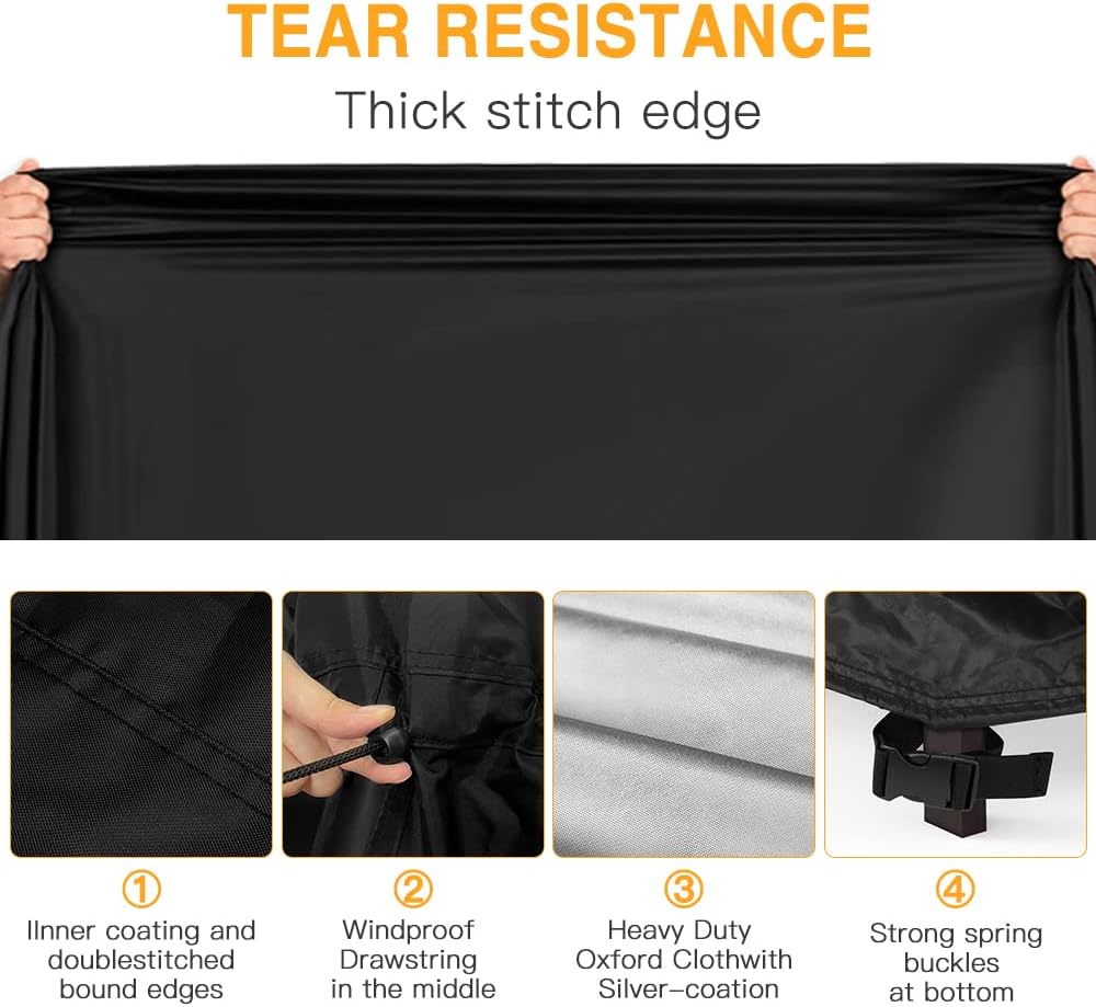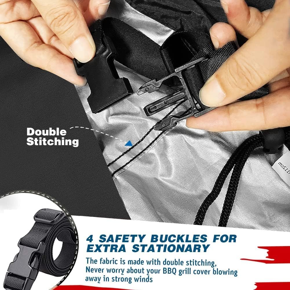 - Snug Fit & Upgraded Windproof BBQ Grill Cover - The bbq grill cover is equipped with padded handles and drawstring straps,360°Drawcord Locking System, the drawstring cords both at the bottom and in the middle can be adjusted for a proper fit.The four buckles at the bottom can quickly tighten,making the grill cover tightly wrapped on your outdoor grill, not being blown away by the wind.