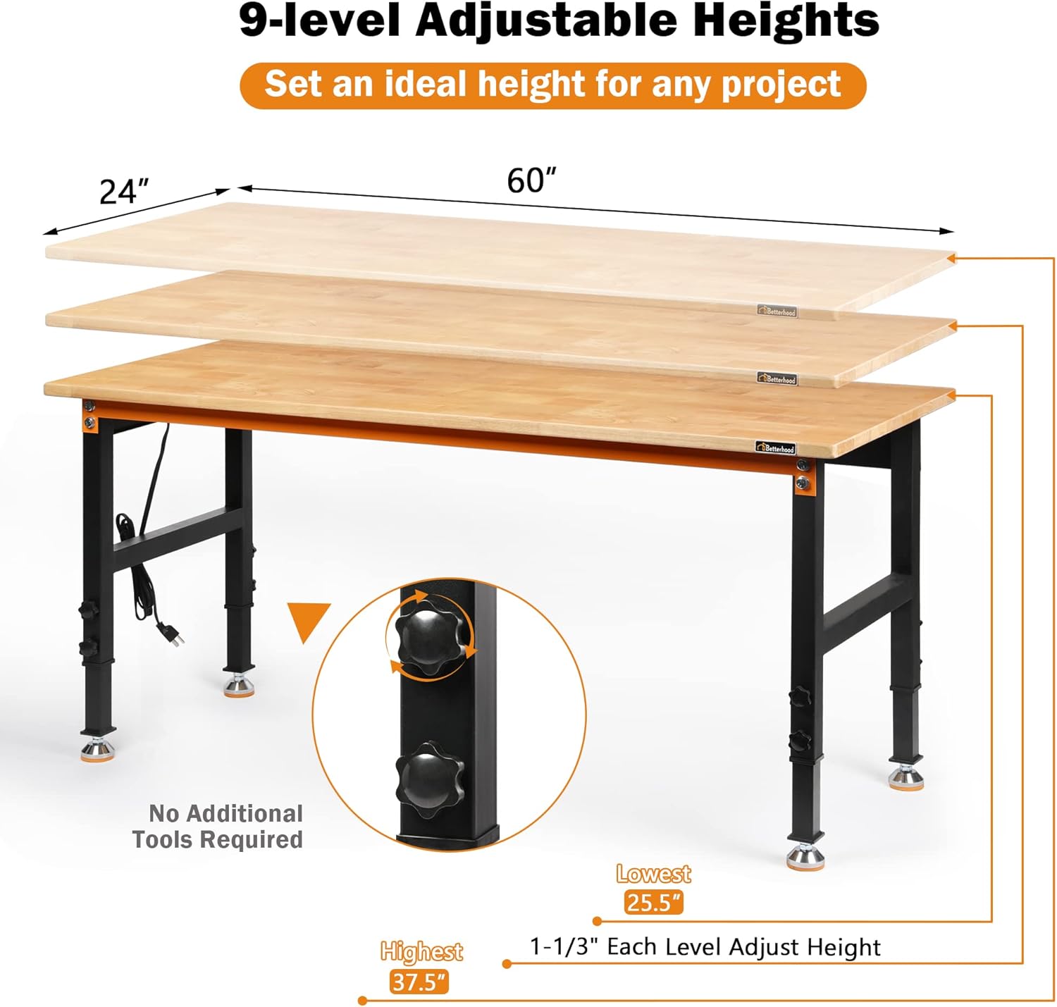 Adjustable Height Workbench, 60" Rubber Wood Top Heavy Duty Workstation with Power Outlets, 2000 LBS Load Capacity Hardwood Worktable for Workshop, Garage, Office, Home, Commercial