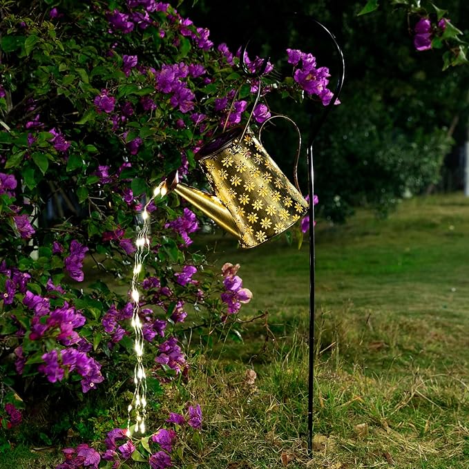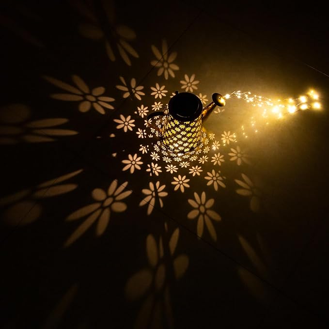 - Terrific decoration: Outdoor solar Lights has a unique and decorative design, can be hung on the porch, tree, or pergola with a hanging ring, or placed on the table or ledge to display a vivid and pretty hollow pattern of leaves, add a warm and pleasant ambience to your yard and deck.Copper wire LED lights can be easily bent and shaped into any shape you like. Choose a special spot in your garden or yard to hang the watering can with lights that appear to be pouring water