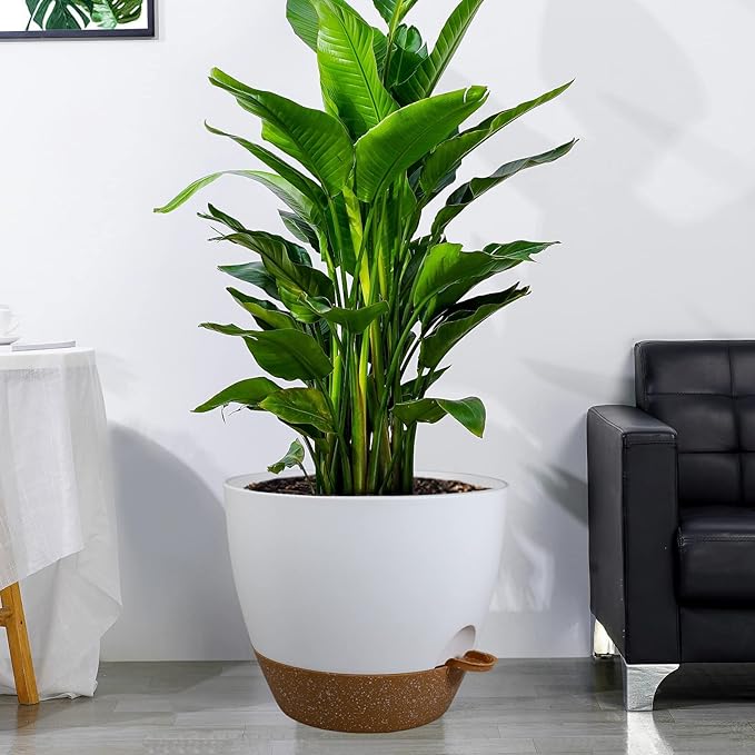 12 inch Large Self Watering Pots, Plastic Planters with 60oZ Removable Deep Reservoir and Multi Mesh Drainage Holes for Indoor Outdoor Garden Plants and Flowers, White with Brown
