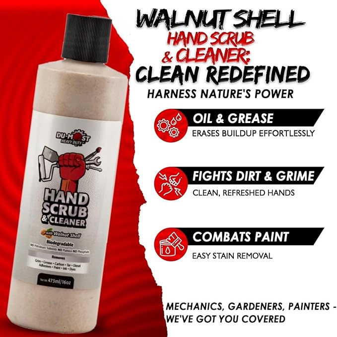 - DU-MOST Hand Scrub & Cleaner with walnut shells is highly effective in removing stubborn stains. Ideal for after-work clean-up for mechanics and farm workers